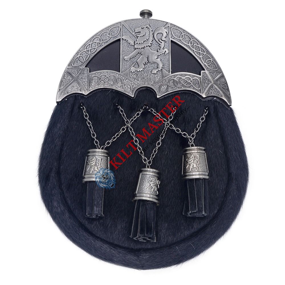 Material: Genuine Seal Skin Color: Black Style: Full Dress Type: Scottish/Highland Tassels: 3 Fastening: Inside Button Attachment: Leather Straps and Chain Hardware: Enamel Lion Cantel, Silver Chrome Size: Adult and Adjustable Kilt Master is the ultimate Scottish clothing and accessories shop that offers an extensive range of high-quality custom-made outfits. We offer kilt sporrans, an essential part of kilt attire.