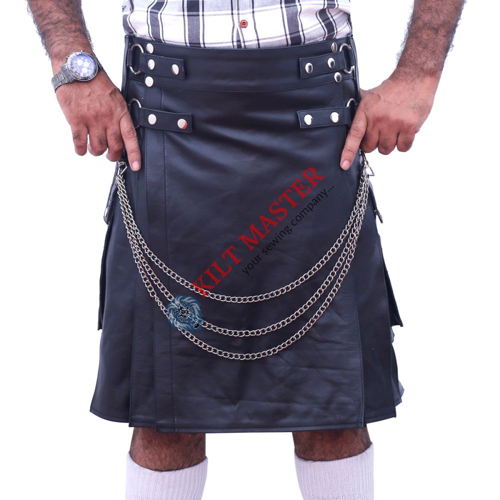 Material: High-Quality Genuine Leather (Cow or Buffalo) Lining: Smooth Satin for Added Comfort Color: Classic Black Style: Utility/Fashion Kilt with a Modern Edge Type: Highland/Utility/Fashion Decorated: Hook, Buttons, D-rings, Chain, Eyelets Pockets: Convenient Flapped Pockets with Secure Button Closure Fastening: Durable Button Fastening Hardware: Choose from Chrome, Gold, Black, or Antique Finish Size: Custom-Made to Fit Your Measurements