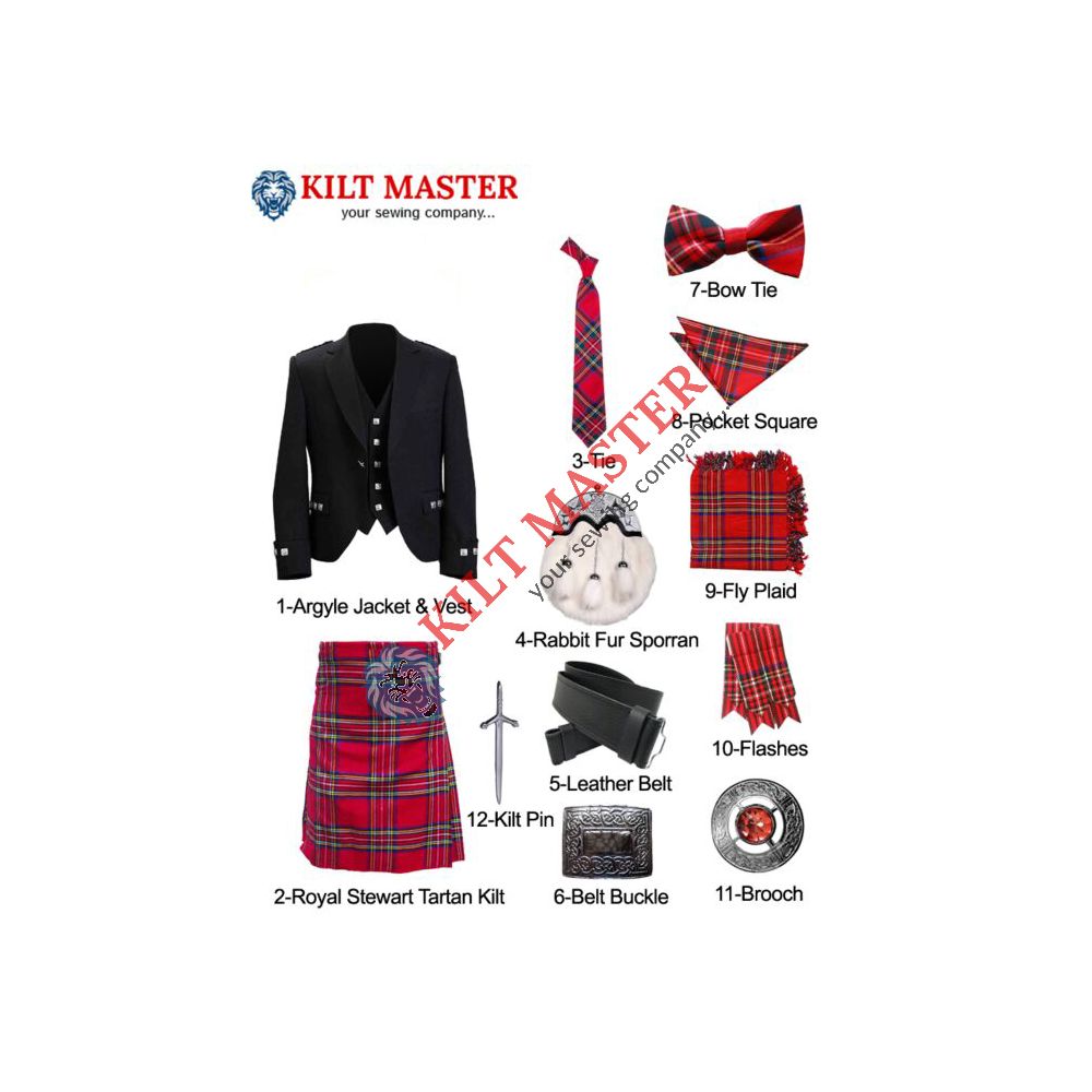 Our Scottish Outfit Deal is an amazing combo loaded with traditional Scottish clothing items from KILT MASTER. This fantastic deal offers you items such as an Argyle Jacket with Vest, a signature Traditional Royal Stewart Tartan Kilt, and many more. Made to suit both men and boys perfectly, the jacket and vest combo is a true classic.