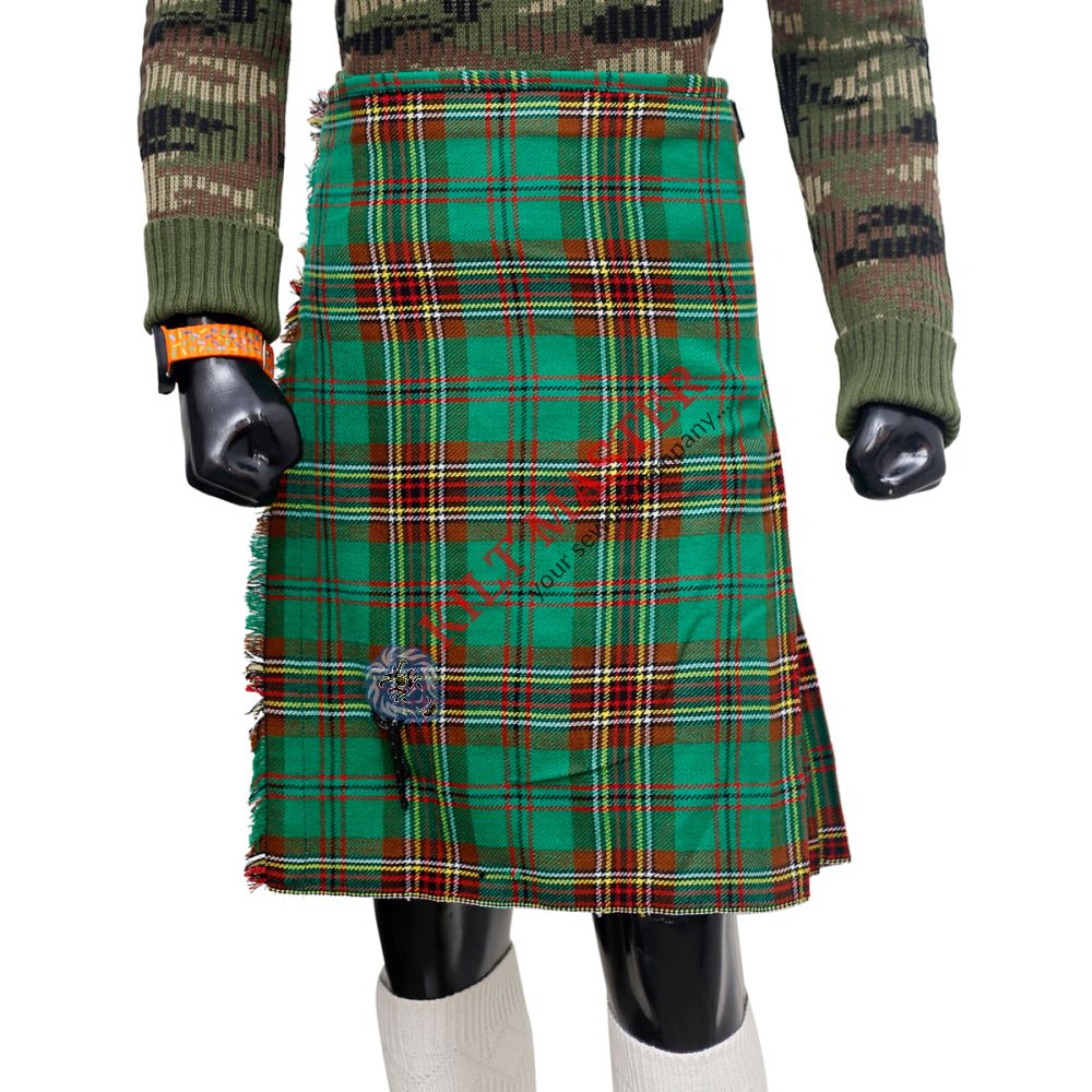 The Tara Murphy tartan kilt is a favored choice among Scots of all ages, perfect for both casual gatherings and sporting events. Crafted from high-quality acrylic wool, this kilt is not only easy to maintain but also resistant to stains, ensuring longevity and convenience. Its vibrant pattern features a harmonious blend of green and white making it a standout piece that adds a touch of Scottish tradition to any occasion. The kilt is designed with three adjustable leather straps and chrome clasps, providing a comfortable and secure fit.