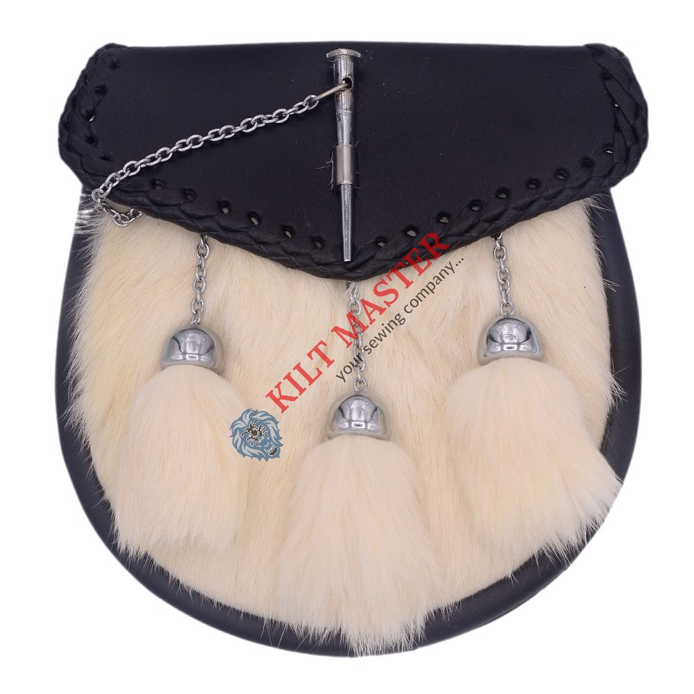 Material: Genuine Leather and White Rabbit Fur Color: White Fur with Black Leather Style: Classic Type: Scottish/Highland Tassels: 3 Fastening: Chrome Pin Lock Attachment: Leather Straps and Chain Hardware: Silver Chrome Size: Adult and Adjustable Kilt Master is the Ultimate Scottish Clothing and Accessories Shop that offers an Extensive Range of High-Quality Custom Made Outfits. We provide kilt sporrans which are an essential part of kilt attire.
