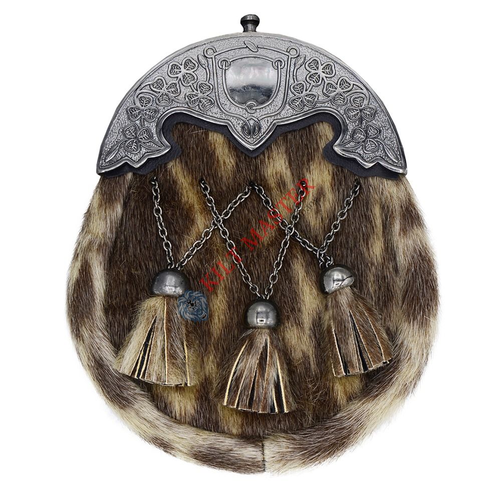 The Seal Skin Sporran with Antique Chrome Cantle is crafted from premium quality seal skin, exuding elegance and tradition. This full dress sporran is an ideal accessory for formal events and special occasions, adding a touch of sophistication to any kilt outfit. The antique chrome cantle and seal skin make this sporran stand out, suitable for enhancing the appearance of any Tartan Kilt. Each sporran comes with an adjustable leather strap and chain, ensuring a perfect fit. Featuring three elegant tassels and a secure button clasp, this sporran combines functionality with classic style.