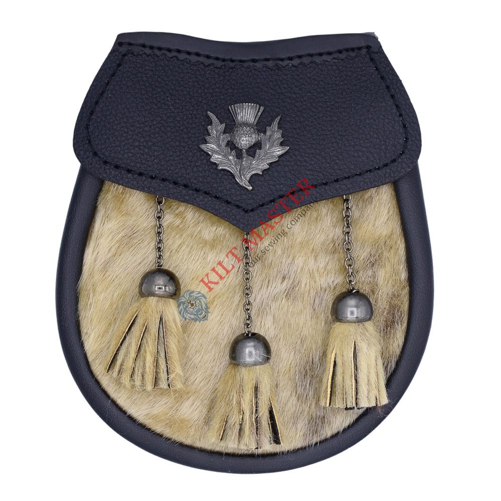 Material: Genuine Sealskin Color: Natural Sealskin Style: Traditional with Thistle Badge Type: Scottish/Highland Tassels: 3 Fastening: Inside Button Attachment: Leather Straps and Chain Hardware: Silver Chrome Size: Adult and Adjustable