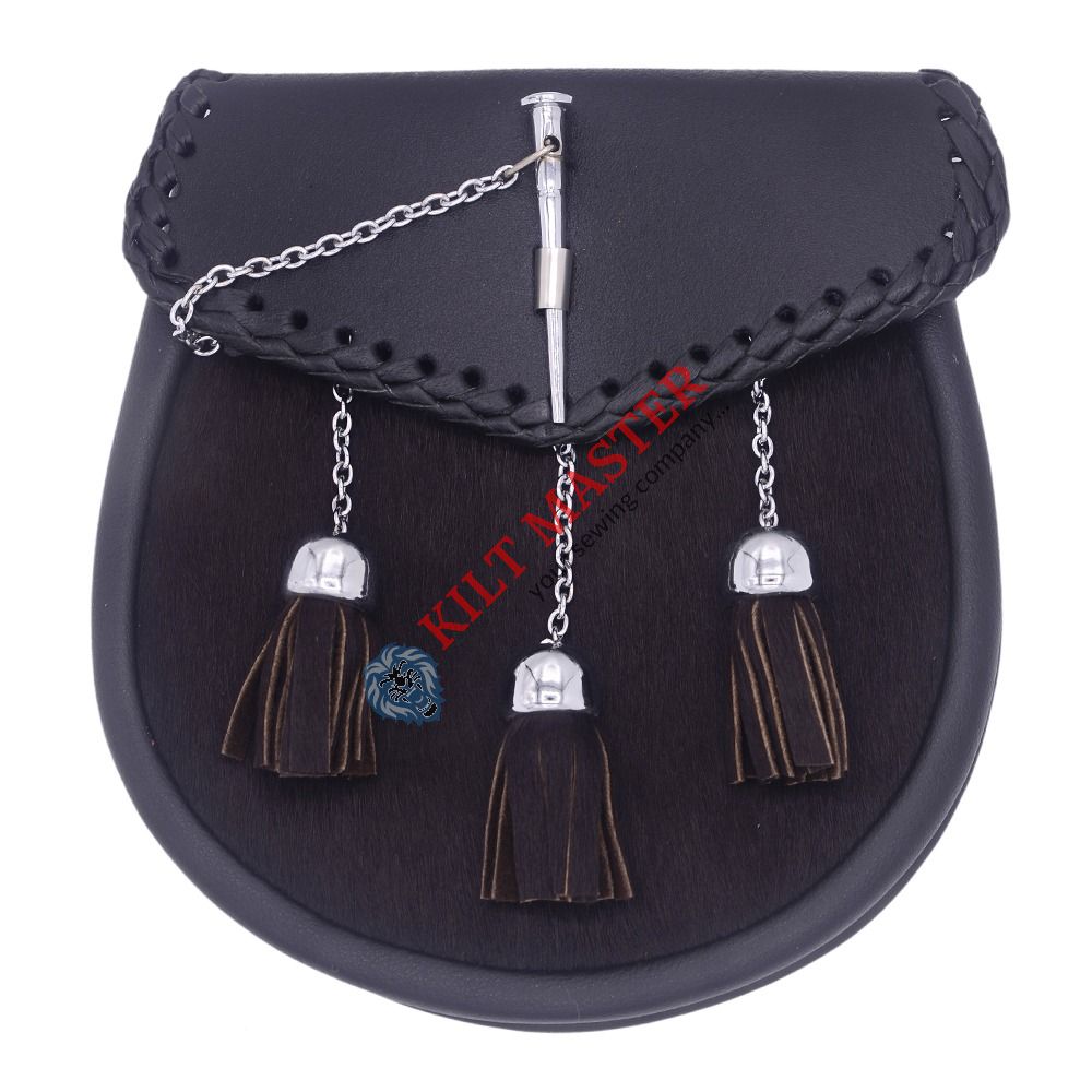 Material: Genuine Leather Color: Black Style: Semi Dress Type: Scottish/Highland Tassels: 3 Fastening: Chrome Pin Lock Attachment: Leather Straps and Chain Hardware: Silver Chrome Size: Adult and Adjustable