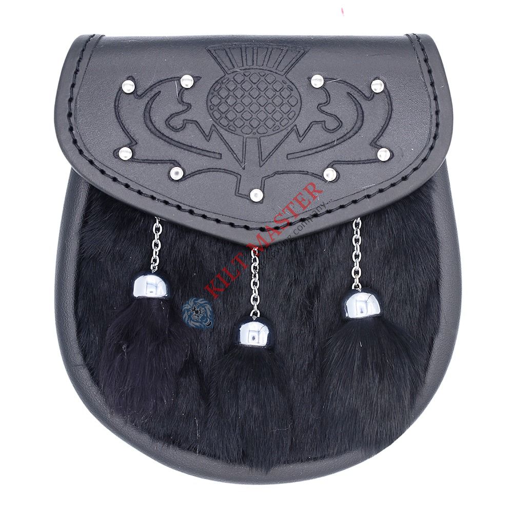 Material: Genuine Leather and Seal Skin Color: Black Style: Semi Dress Type: Scottish/Highland Tassels: 3 Fastening: Inside Button Attachment: Leather Straps and Chain Hardware: Silver Chrome Size: Adult and Adjustable