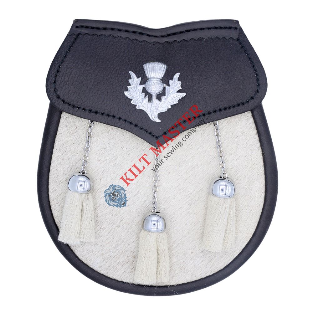 Material: Genuine Leather Color: White Style: Semi Dress Type: Scottish/Highland Tassels: 3 Fastening: Inside Button Attachment: Leather Straps and Chain Hardware: Silver Chrome Size: Adult and Adjustable