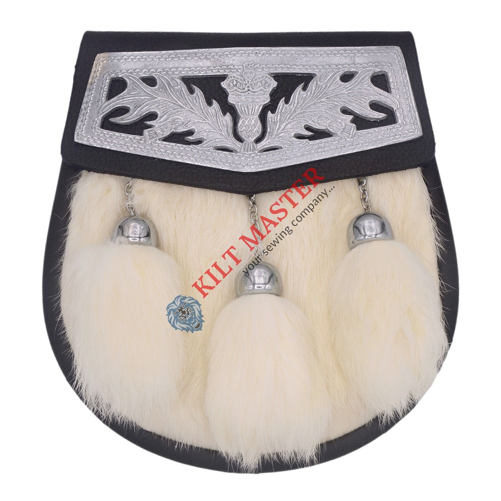 Material: Genuine Leather and White Rabbit Fur Color: Black with White Fur Style: Semi Dress Type: Scottish/Highland Tassels: 3 Fur Tassels Fastening: Inside Button Attachment: Leather Straps and Chain Hardware: Silver Chrome Size: Adult and Adjustable Kilt Master is the Ultimate Scottish Clothing and Accessories Shop that offers an Extensive Range of High-Quality Custom Made Outfits. We provide kilt sporrans, an essential accessory for completing your traditional Scottish attire.