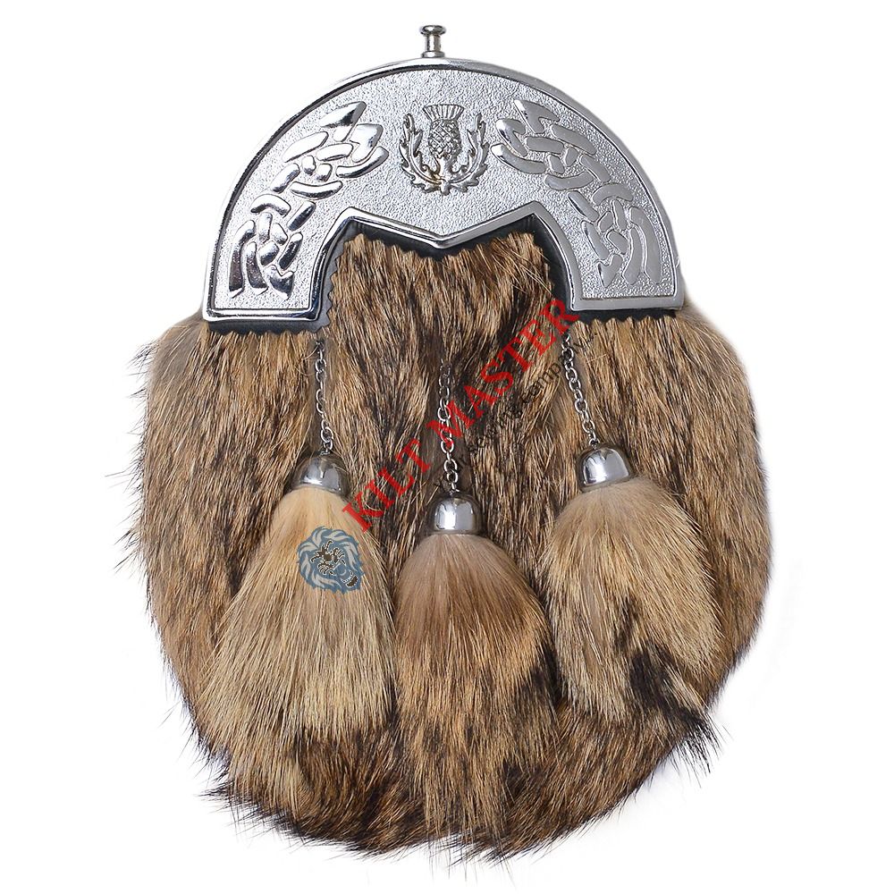 The Silver Cantle brown Fox Fur Sporran with 3 Tassels is a high-quality Scottish accessory made for adults. It features genuine fox fur with a beautiful brown color and a silver-colored cantle for a touch of elegance. This sporran is perfect for Highland Attire and can be worn at special events. Its made-to-measure size ensures it fits comfortably on any adult. The design includes three tassels that add extra flair. It’s a stylish piece that combines tradition with sophistication, making it a great addition to any Scottish outfit or costume.