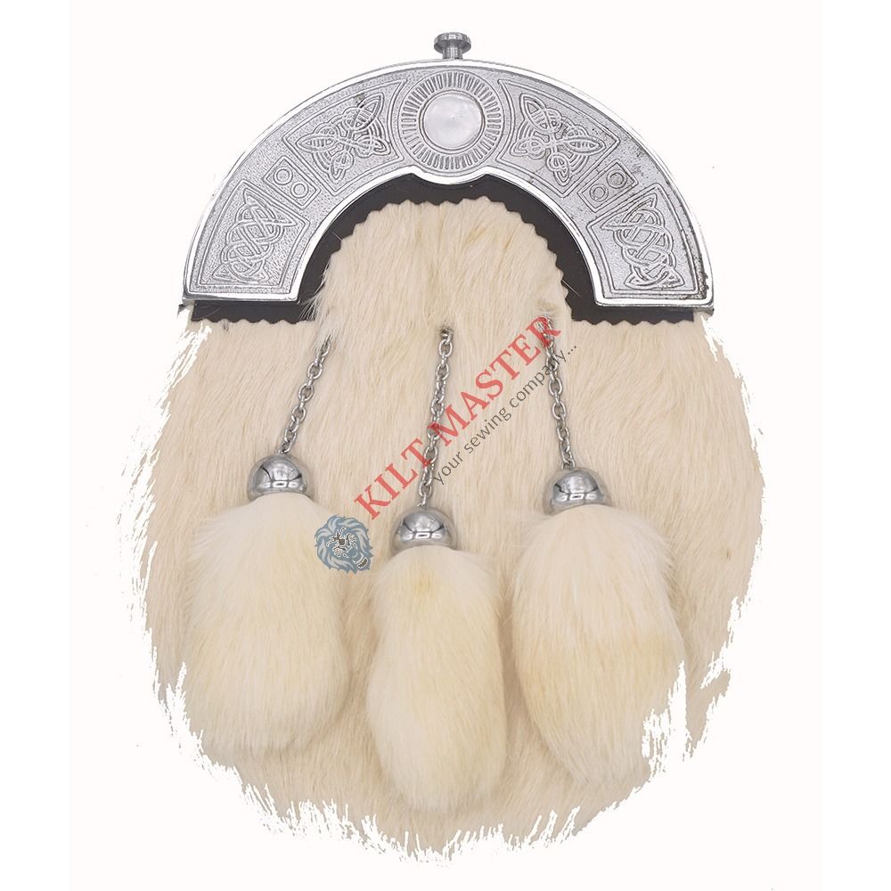 Material: Genuine Rabbit Fur Color: Silver/White Style: Traditional Type: Scottish/Highland Tassels: 3 Fastening: Inside Button Attachment: Leather Straps and Chain Hardware: Silver Chrome Cantle Size: Adult and Adjustable Kilt Master is the Ultimate Scottish Clothing and Accessories Shop that offers an Extensive Range of High-Quality Custom Made Outfits. We offer kilt sporrans which are an essential part of kilt attire.