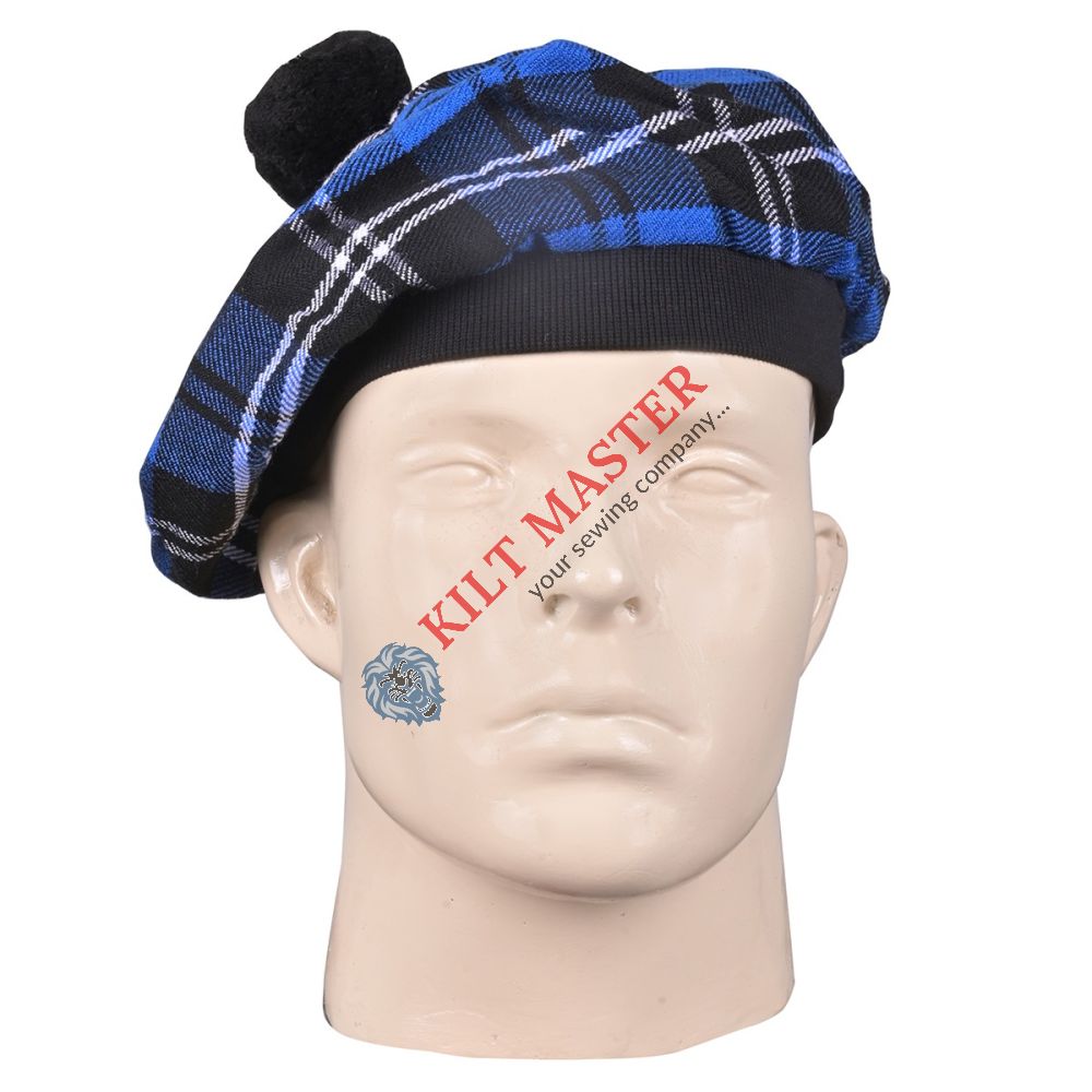 Material: Acrylic Wool Tartan: Ramsay Blue Tartan Rib: Elastic Black Pompom Color: Black / Matching Lining: Cotton Size: Free / Adjustable Fit Unisex: Men, Women, Kids, LGBTQ