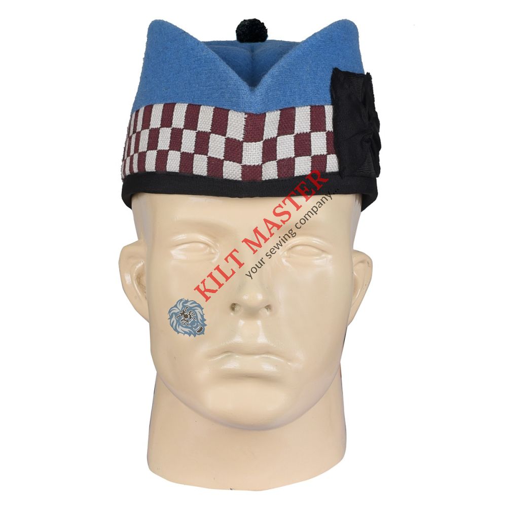 Traditional Glengarry Hat made from 100% wool in sky blue color. Features black trim, pompom, and cockade with maroon white dicing. Comfortable lining and multiple sizes available for perfect fit.