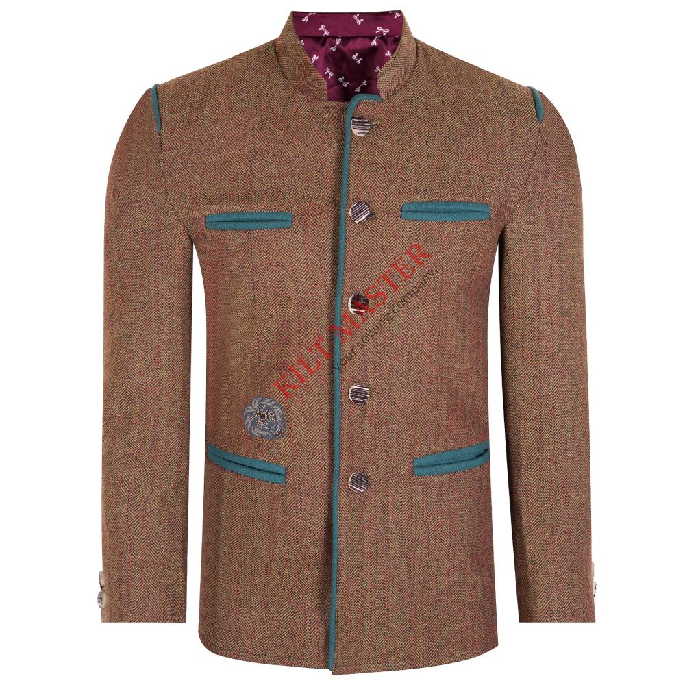 Material: Premium Tweed Fabric: Premium Quality Tweed Style: Bavarian Type: Traditional German Lining: Satin Fastening: Front buttons Pockets: Stylish welt pockets Collar: Stand-up with optional embroidery Cuffs: Contrasted accents Inside Pockets: Two secure compartments Size: Made to Order