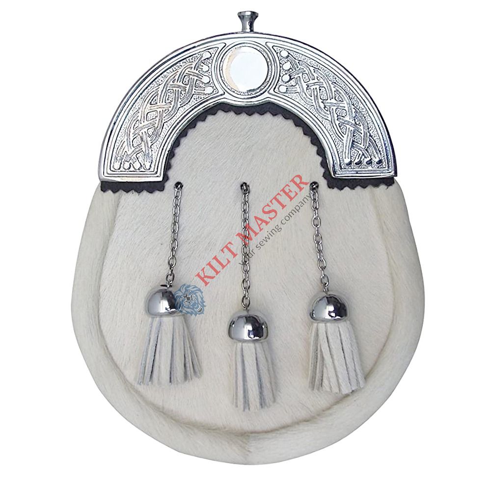 Material: Genuine Rabbit Hair Color: White Style: Full Dress Type: Scottish/Highland Tassels: 3 Fastening: Inside Button Attachment: Chain Belt and Strap Hardware: Silver Chrome Size: Adult and Adjustable Kilt Master is the Ultimate Scottish Clothing and Accessories Shop that offers an Extensive Range of High-Quality Custom Made Outfits. We provide kilt sporrans that are essential for completing the traditional kilt ensemble.