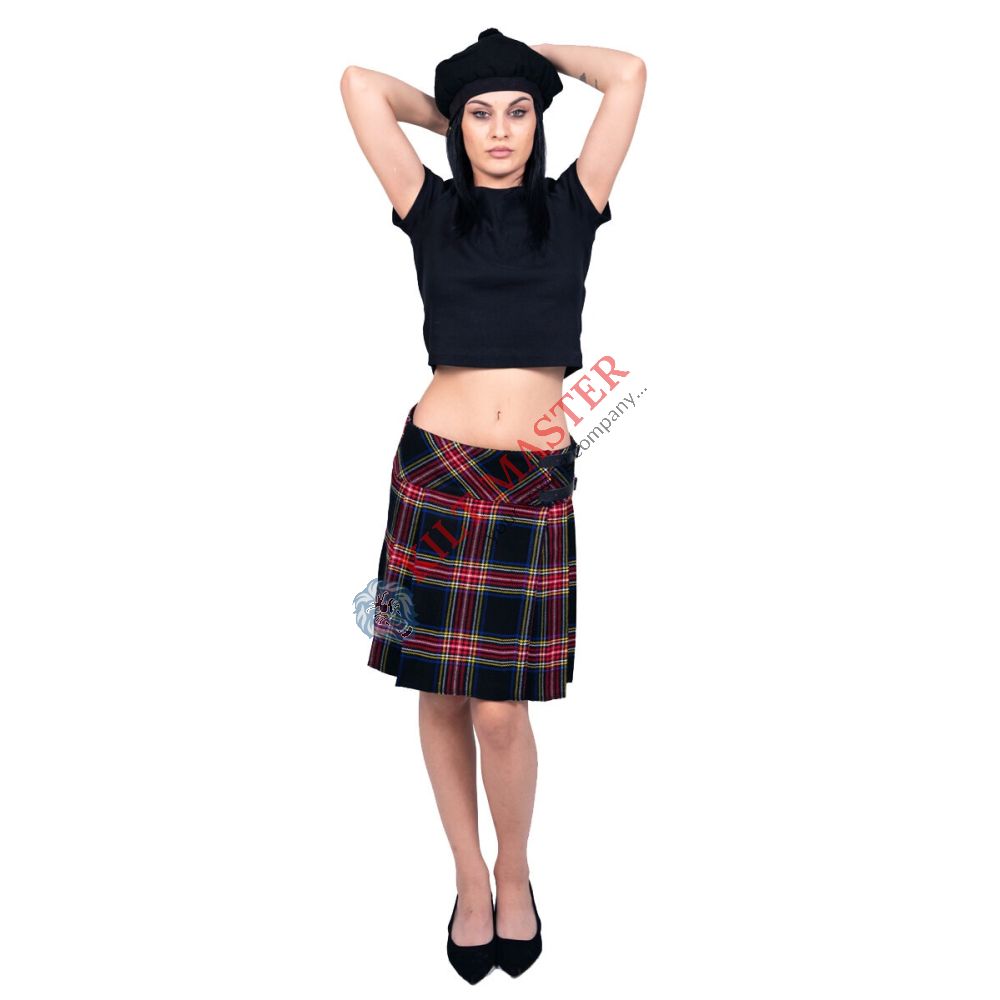 You can style the women black Stewart tartan skirt in many ways. For a casual look, pair it with a simple top and flats or ankle boots. For a more formal style, combine it with a blouse and heels. Layering with a blazer or cardigan adds sophistication. The tartan pattern works well with neutral colors like white, black, or cream. You can also add accessories like jewelry or scarves to personalize your outfit. This versatile skirt in black Stewart tartan is easy to dress up or down, making it perfect for different occasions. It’s a great way to showcase your unique style while embracing classic tartan fashion.