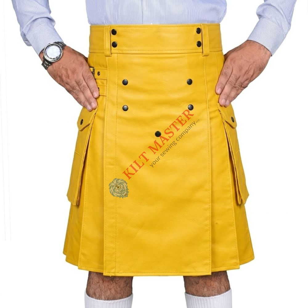 Yellow Leather Utility Kilt is stylish, durable, and modern. Made from high-quality leather, it offers comfort, strong fit, and bold look. Perfect for events, casual wear, and fashion lovers.